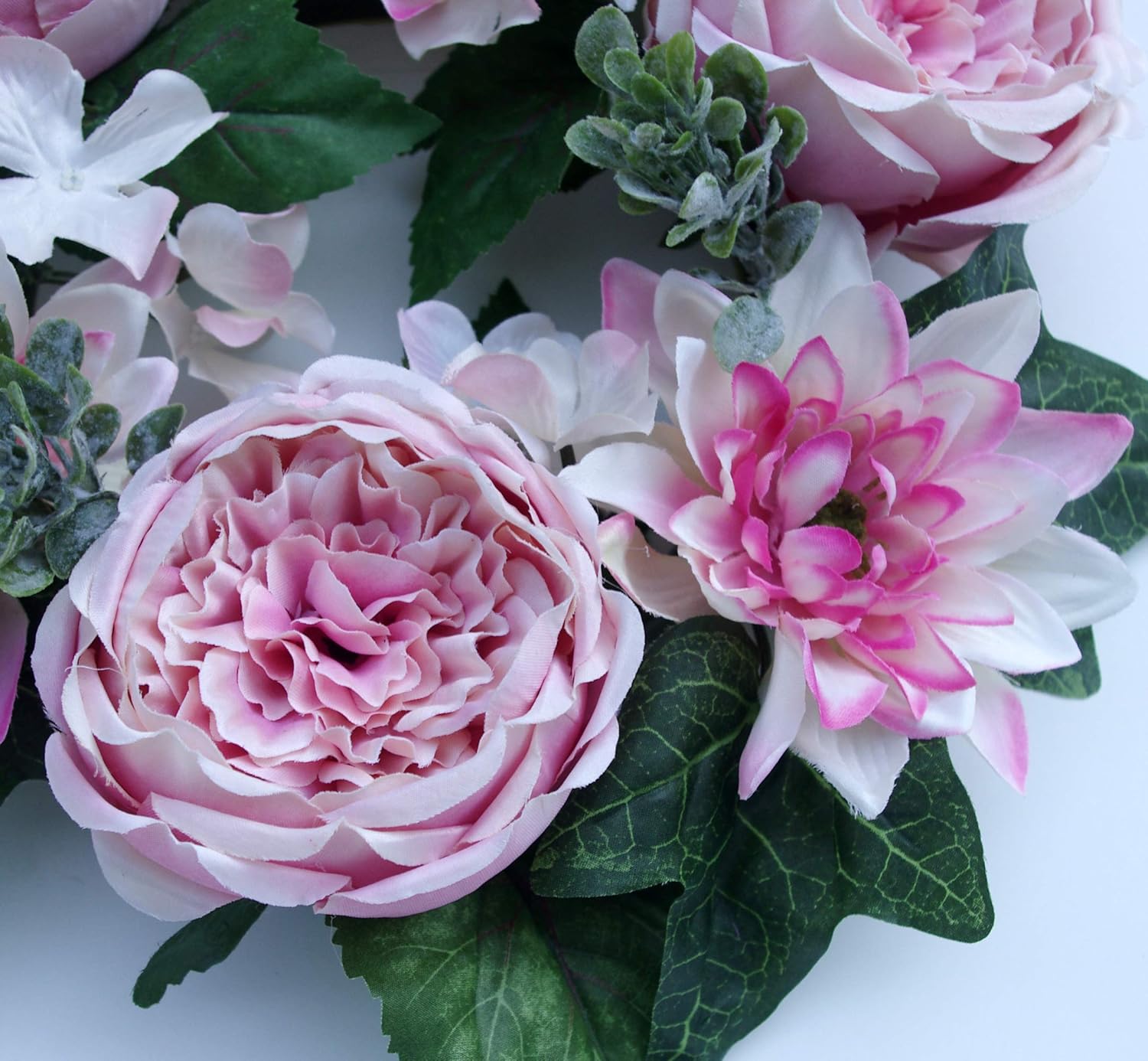 Decorated with blooming Pink Cabbage Rose Dahlia Hydrangea Fern leaf boxwood ect. Maximum Wattage per bulb. Like a fresh flower arrangement for your door the Dahlia Hydrangea Rose Wreath greets you with a dense symmetrical and multicolored composition of faux foliage.