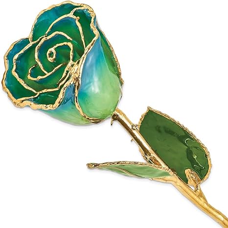 Allmygold Long Stem Dipped 24K Gold Peridot Blue Lacquered Rose in Gift Box. Comes packaged in a gift box with Certificate of Authenticity. 24K Gold Teal Blue Rose Everlasting Real Rose Dipped in Gold wStand Anniversary.