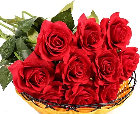 Amazon Com Kismeet Artificial Roses Fake Silk Flowers Real Touch Long Stem For Wedding Party Home Office Outdoor Craft Decoration Pack Of 10 Red Home Kitchen
