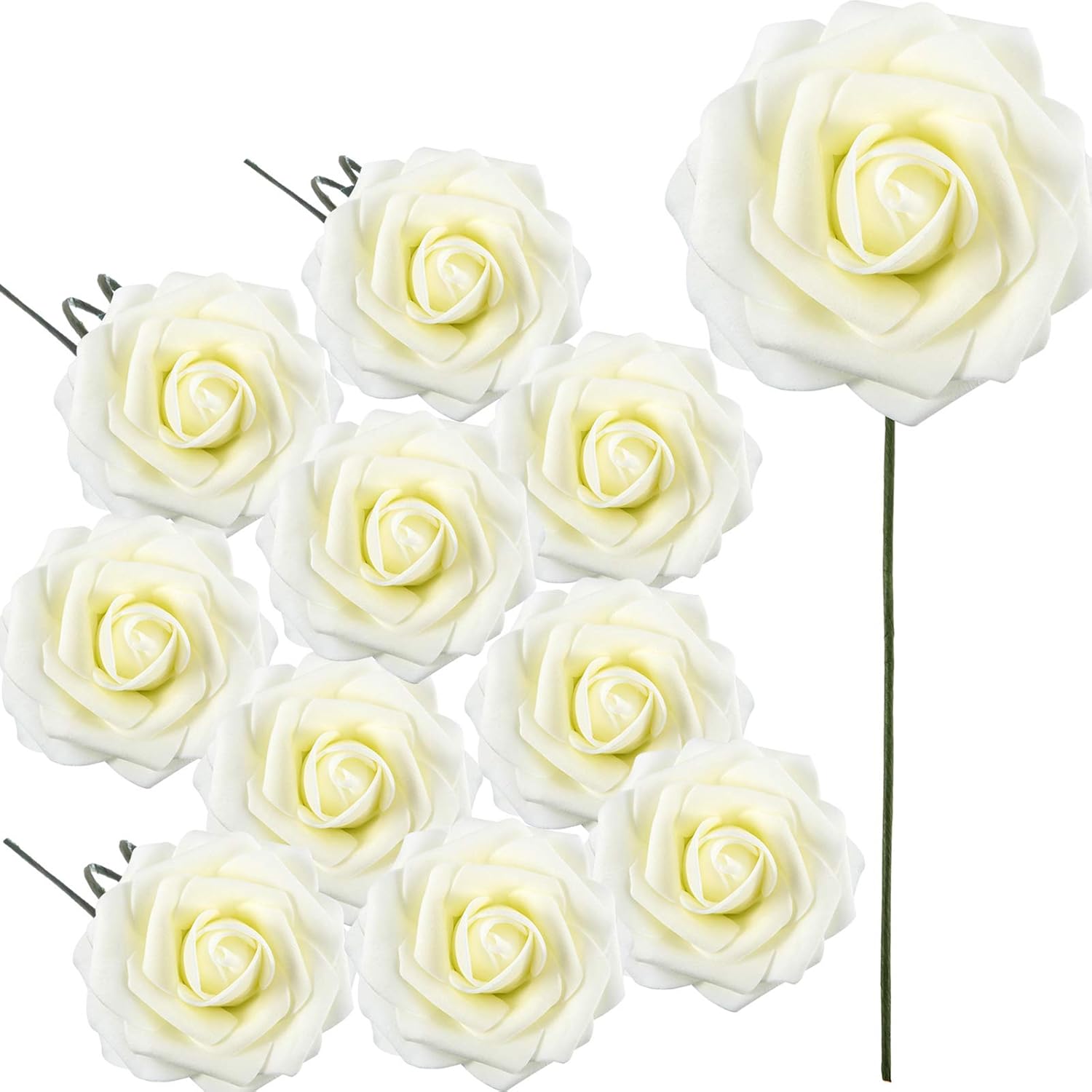 Amazon Com Poen 100 Pieces Artificial Flowers Roses Foam Rose With Stem For Diy Wedding Bouquets Centerpieces Party Baby Shower Home Decorations Cream White Kitchen Dining
