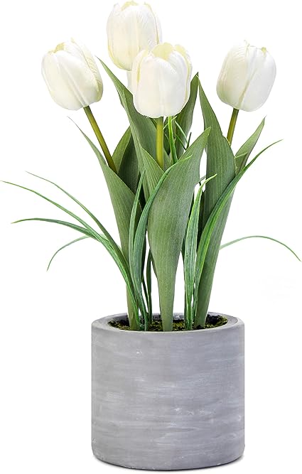 Jusdreen Artificial Potted Tulips Flowers With Cement Vase Vivid Tulip Flowers Arrangement For Home Office Decor House Decorations 5 White Tulips Home Kitchen Amazon Com